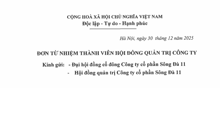 Báo cáo tài chính, Công bố thông tin BÁO CÁO TÀI CHÍNH TỔNG HỢP QUÝ I VÀ LŨY KẾ 31 THÁNG 03 NĂM 2025 VI-Baocaotaichinh_Tonghop_Q1_2025 EN-Baocaotaichinh_Tonghop_Q1_2025 Bài viết liên quan Thông báo về việc Công ty cổ phần Sông Đà 11 nhận được Đơn từ nhiệm của Ông Vũ Trọng Vinh – Thành viên HĐQT và Ông Đoàn Hải Trung – Thành viên Ban kiểm soát Công ty Thông báo về ngày đăng kí cuối cùng để thực hiện quyền cho người sở hữu chứng khoán Thông báo về ngày đăng ký cuối cùng để thực hiện quyền tham dự Đại hội đồng cổ đông bất thường năm 2026