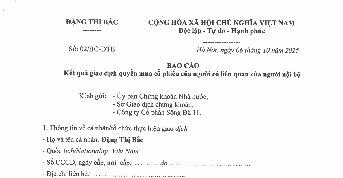 Công bố thông tin, Quan hệ cổ đông Kết quả giao dịch quyền mua cổ phiếu của người có liên quan của người nội bộ CTDT 7 ngay thuc chien AI Bài viết liên quan Thông báo bổ nhiệm Phó Tổng giám đốc công ty Cổ phần Sông Đà 11 chấp thuận thay đổi niêm yết cổ phiếu của Công ty cổ phần Sông Đà 11 Báo cáo tài chính quý III năm 2025