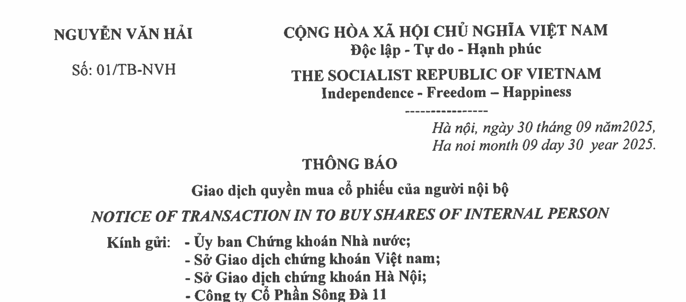 Thông báo 01 – Giao dịch mua Cổ phiếu người nội bộ – ông Nguyễn Văn Hải