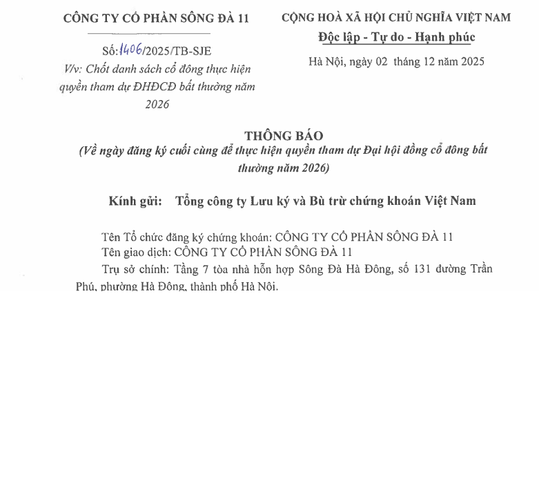Công bố thông tin, Quan hệ cổ đông Thông báo về ngày đăng ký cuối cùng để thực hiện quyền tham dự Đại hội đồng cổ đông bất thường năm 2026 CV 1406 Bài viết liên quan Thông báo về ngày đăng kí cuối cùng để thực hiện quyền cho người sở hữu chứng khoán Báo cáo sử dụng vốn điều lệ THÔNG BÁO Ngày giao dịch đầu tiên của cổ phiếu thay đổi đăng ký niêm yết CTCP Sông Đà 11