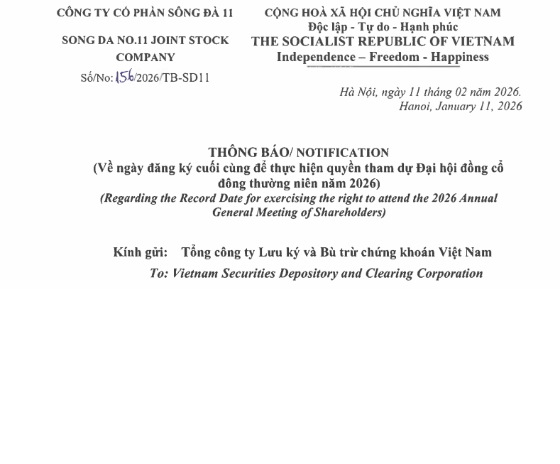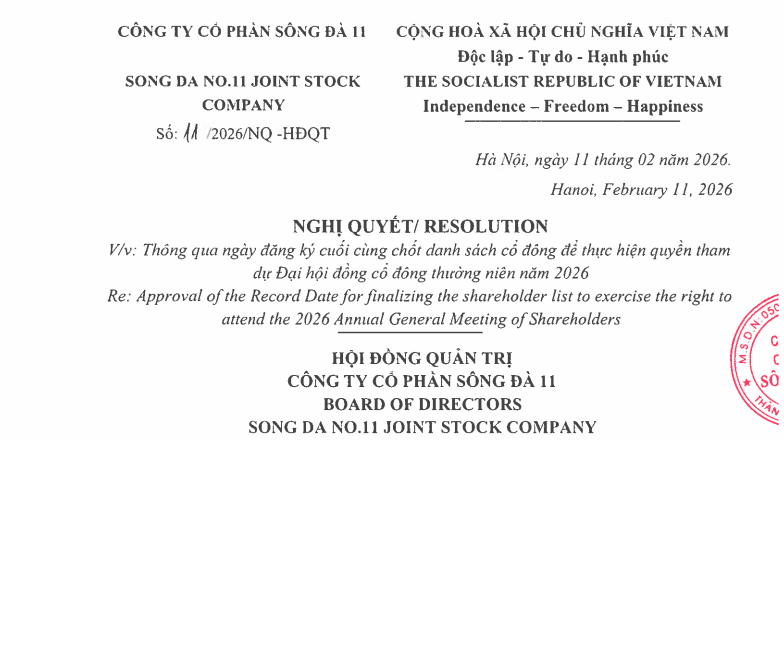 Công bố thông tin, Quan hệ cổ đông Thông báo về việc Công ty cổ phần Sông Đà 11 nhận được Đơn từ nhiệm của Ông Vũ Trọng Vinh – Thành viên HĐQT và Ông Đoàn Hải Trung – Thành viên Ban kiểm soát Công ty Mr Trung Don Tu nhiemMr Vinh Don Tu nhiem Bài viết liên quan Thông báo về ngày đăng kí cuối cùng để thực hiện quyền tham dự Đại hội đồng cổ đông thường niên năm 2026 Nghị quyết thông qua ngày đăng kí cuối cùng chốt danh sách cổ đông để thực hiện quyền tham dự Đại dự đại hội đồng cổ đông thường niên năm 2026 BÁO CÁO TÀI CHÍNH QUÝ IV NĂM 2025